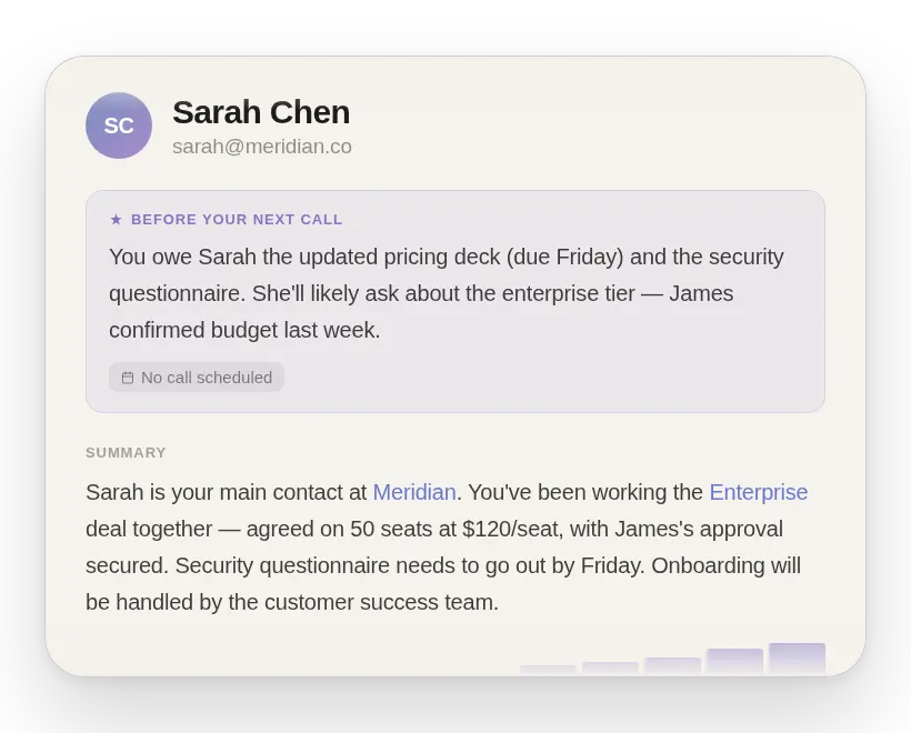 A name dropped on a call. A detail on a profile. A decision buried in a thread. Soda picks up on what matters and holds onto it, so it's there when you or your team need it.